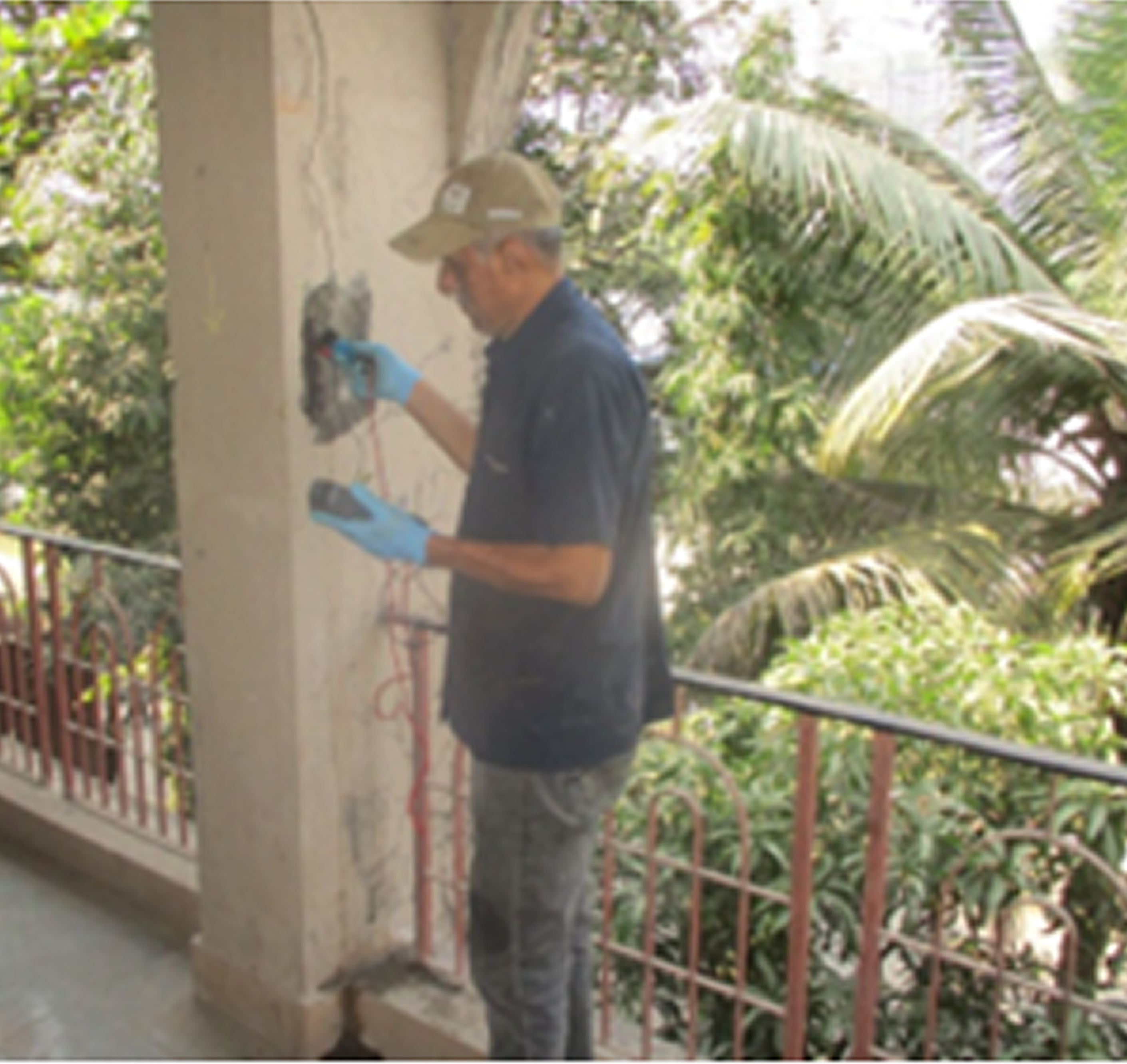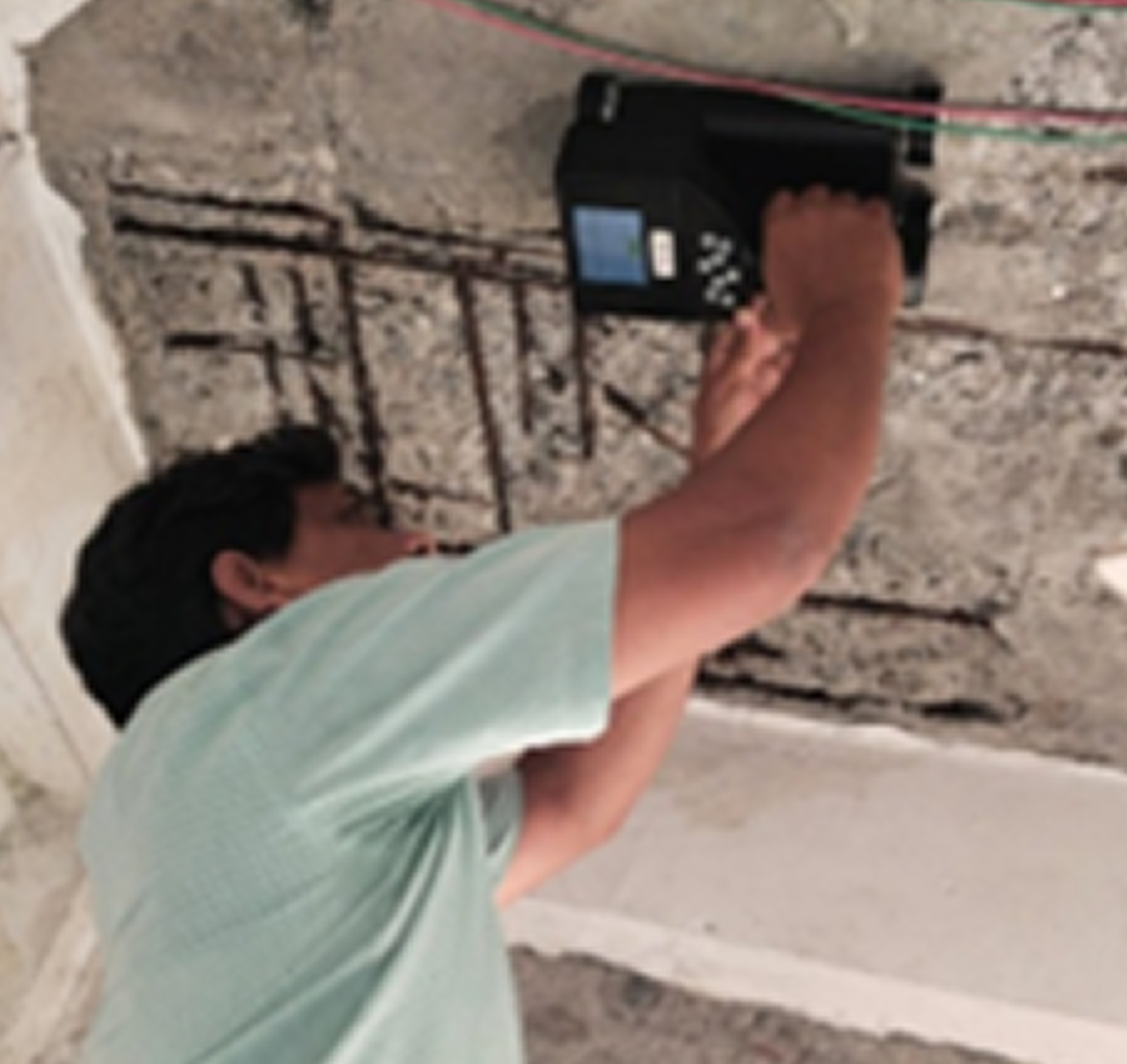 To check the true condition of the building, a large number of non-destructive tests (NDT) were conducted. These included: rebound hammer, ultrasonic pulse velocity (UPV) test, carbonation test, half-cell potential measurement, core sampling and chemical analysis, and rebar scanner/cover meter testing. Beta test prototype of ReX 100 (CS 100) was used for cover meter testing. The results painted a grim picture: