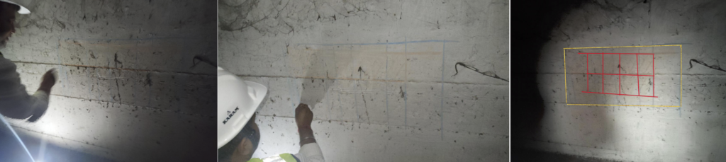 - Grid layout and surface marking: Chalk grids (both orthogonal and aligned with the pier’s curvature) were applied to guide the scanner along consistent paths.