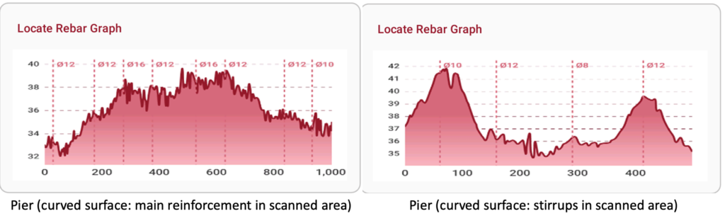 Despite these inherent challenges, the ReX 100 maintained stable coupling with the surface due to its optimized sensing geometry. By aligning the scanning grid tangentially to local curvature radii, the device generated consistent amplitude peaks corresponding to rebar locations.