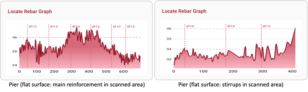 Digital data export from the mobile app in form of PDF report enabled precise and simplified evaluation of bar spacing, depth distribution, and mesh patterns, supporting high-confidence structural verification. Rebar detail graphs of pier from the PDF reports are shown below for reference.