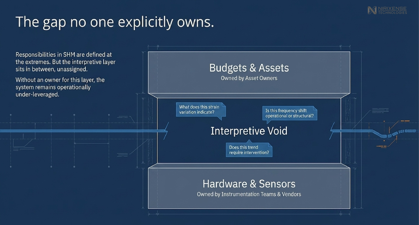 If we map out a typical SHM deployment, responsibilities are clearly defined up to a point. Instrumentation teams handle sensor placement and calibration. Vendors manage acquisition systems and data transmission. Asset owners oversee budgets and implementation.